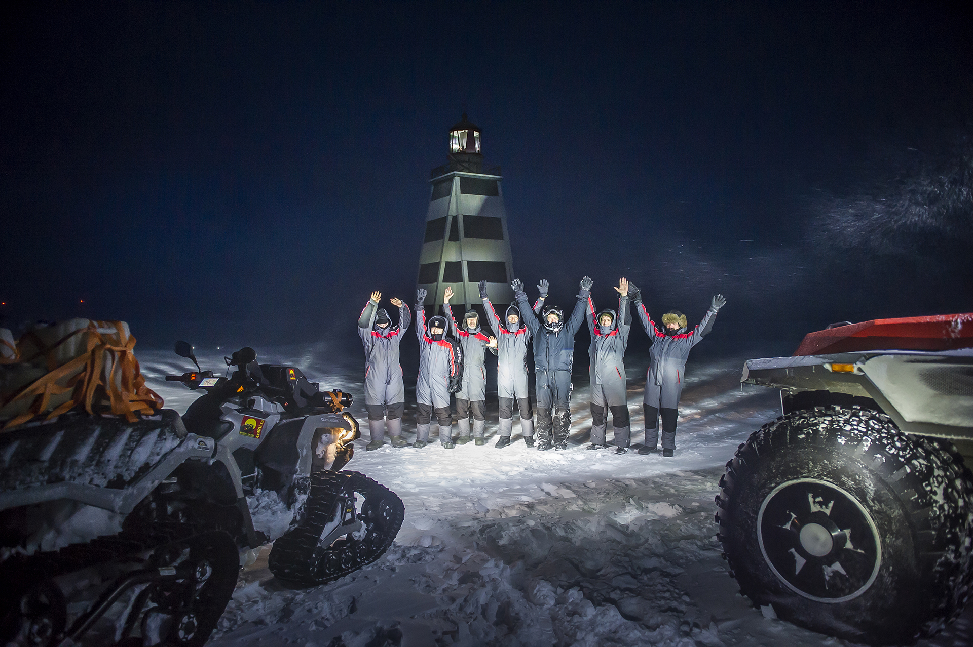 We arrived at Canin Nos! The day before, on March 12 at 5 o’clock in the morning we reached the lighthouse. People and the equipment made it! The road from Shoyna was not particularly difficult, but the biggest part of the trip was made in full darkness and it was not easy to navigate, but there was a navigator! The ice on the rivers was strong - we moved without any problems, although at first there were thoughts of moving away from the sea in order to move to the other shore more safely. Then we drove out to the ice of rivers and streams without fear. We heard about the crevices covered by snow, but somehow we did not notice them. But Shaman got stuck in soft fluffy snow a couple of times, in spite of his big wheels, however, with the help of the quad bike, used as an anchor for the rear winch, it was easy to get out of the trap. The most difficult place was a steep climb right after the Bolshaya Bugryanitsa river. The Shaman overcame this climb in a few steps, starting from the trodden track.